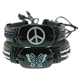 Bracelets - Leather , Genuine Dark Leather Bracelet with Butterfly and Peace Sign Designs - Adjustable Length - Sold as a set of 2 (Read More)