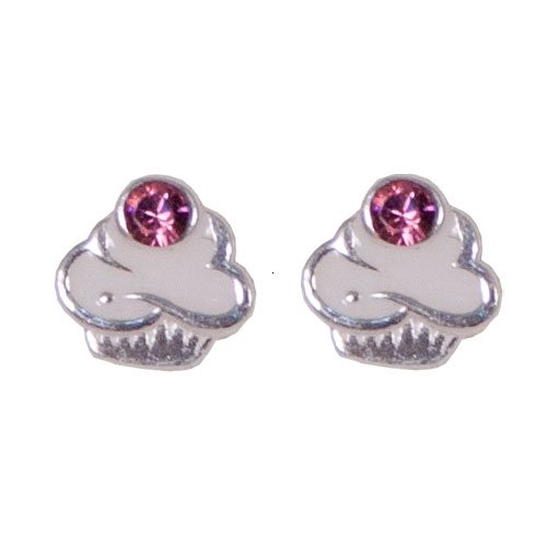 CecisCollection.com , These petite sterling silver enamel post earrings are irresistible! Delicious looking cupcake post earrings topped with a crystal accent MADE WITH SWAROVSKI® ELEMENTS. These Tomas Jewelry cupcakes are completely guilt-free! The shimmering sterling silver base resembles the foil cupcake baking cups. These cupcakes appear to have lots of fluffy white frosting, which is actually durable enamel color in pure white. The crystal accents that top these cupcake earrings are pink Swarovski crystals. Swarovski crystals are famous for their incredible sparkle, and these petite earrings have big-time sparkle!