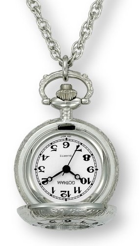 Gotham GWC14118S, This beautiful heirloom series silver-tone covered pendant watch from Gotham watch is the perfect addition to your jewelry collection or an excellent gift for a loved one. Features include a unique and detailed case design with Arabic numerals and a center display window, rich white dial, black Arabic classic numeral markers, antique style hands plus a precision Japanese quartz movement. Also included is a 28 inch silver-tone rope chain. As always, your timepiece will arrive gift boxed and include operating instructions and a lifetime limited warranty.